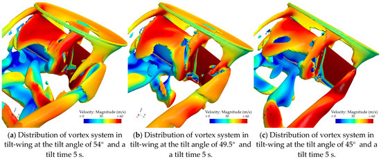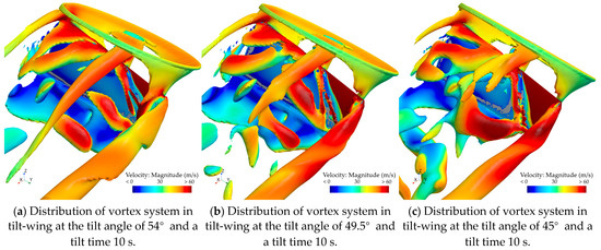 The vortex distribution of the wing is plotted using the same method as in the previous section. Figure 19a–c depict the distribution of the wing’s vortex system for tilt angles of 54°, 49.5°, and 45°, at the tilt time of 10 s, respectively. Figure 20a–c illustrate the distribution of the wing’s vortex system for tilt angles of 54°, 49.5°, and 45°, at the tilt time of 5 s, respectively.