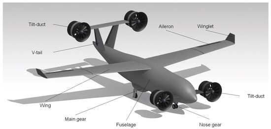 In the literature, a lot of research on tilt-duct VTOL aircraft and its related technologies has been carried out. Ref. [] has presented the conceptual design of a tilt-duct VTOL UAV including descriptions of design requirements, mission profile, initial sizing, geometry selection, and basic overall aircraft design level performance. Ref. [] has introduced the conceptual design of a UAM reference aircraft that has six tilting ducted proprotors, which indicates that the tilt-duct aircraft has advantages in performance such as lift-to-drag ratio and cruise airspeed when compared with other six-passenger NASA UAM reference aircraft configurations. Ref. [] has performed a feasible study on the full electric tilt-duct VTOL aircraft based on a conceptual design and system level analysis, showing necessities for airframe and/or energy system improvement. Chang et al. [] carried out full conversion flight tests for a 40 kg tilt-duct UAV for a better understanding of the transition features between the helicopter and the airplane mode. To overcome the scale-effect issue and to support the research community, scholars from Georgia Institute of Technology and NASA Langley Research Center have introduced a 453 kg (1000 lb) gross weight eVTOL reference aircraft with detailed aircraft geometry and comprehensive data from flight tests [].