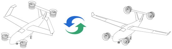 Hover mode and cruise mode of the reference tilt-duct UAV, the arrow indicates that the UAV can switch between two flight modes.