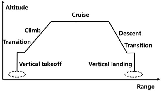 The design mission profile of the reference tilt-duct UAV is presented in Figure 4, which includes vertical takeoff, transition, climb, cruise, descent, transition, and vertical landing.