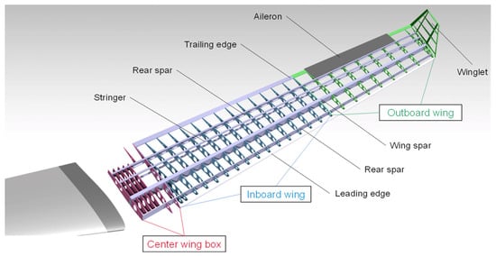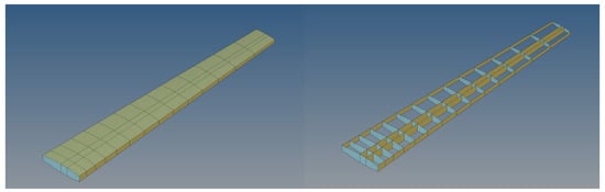 The wing box serves as the primary load-bearing structure of the wing, making its structural performance the central focus of analysis and optimization. On the basis of the previous section regarding wing structure design, we established a simplified wing box finite element model consisting of wing spars, wing ribs, and upper and lower skins for the wing’s structural optimization. Figure 11 shows the simplified finite element model of the wing structure. Note that composite materials are used for the skins, wing spars, and front and rear webs, and aluminum alloy is used for the wing ribs.