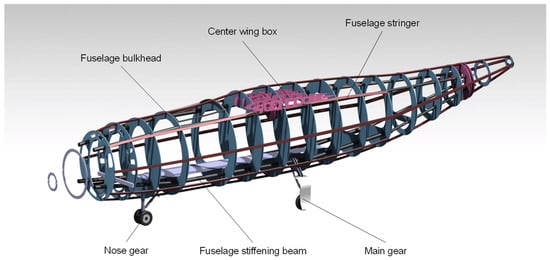 Considering that the tilt ducts are installed at the nose and tail positions, this study adds four stiffening beams running through the fuselage (from nose to tail) based on the existing fuselage structure of fixed-wing aircraft, which can effectively transfer the forces generated by the ducts in hover mode. This design feature significantly enhances the fuselage’s bending capability and accessibility, subsequently increasing the available space for accommodating retractable landing gear, as well as facilitating the replacement of loads and equipment. Additionally, the stiffening beams are also connected to the center wing box to effectively transfer the lift generated by the wing in cruise mode Figure 6.