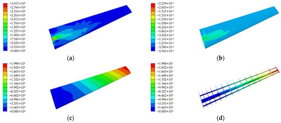 Wing structure analysis based on FEM. (a) Wing stress (Mpa). (b) Wing strain (με). (c) Wing deformation (mm). (d) Internal structure deformation (mm).
