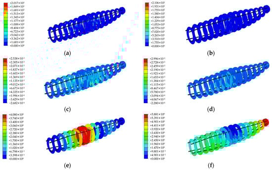 Fuselage structure analysis based on FEM. (a) Fuselage stress at hover mode (Mpa). (b) Fuselage stress at cruise mode (Mpa). (c) Fuselage strain at hover mode (με). (d) Fuselage strain at cruise mode (με). (e) Fuselage deformation at hover mode (mm). (f) Fuselage deformation at cruise mode (mm).