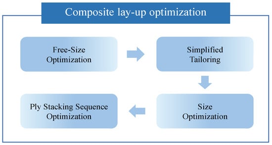 In this section we focus on the optimization of the composite wing box, as shown in Figure 12, including free-size optimization, lay-up shape tailoring, size optimization, and ply stacking sequence optimization. We formulate the wing box structure design as an optimization problem. The objective is to minimize the wing structure mass while satisfying the design constraints regarding strength, stiffness, and the requirements of the production process, including the minimum manufacturable ply thickness and the percentage of total ply thickness in a given direction. Figure 12 shows the overall optimization process of the composite wing box.