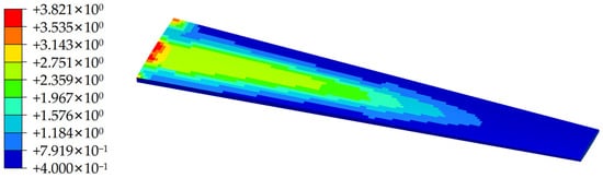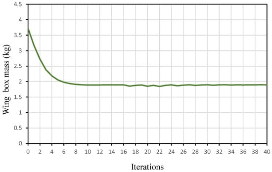 Figure 13 shows the history of the objective function with number of iterations. After 40 steps of iteration, the mass of the wing box is reduced from the initial 3.73 kg to 1.89 kg, i.e., a 49.3% reduction in which mass via free-size optimization, while the stress and strain design constraints are satisfied. The results of the overall thickness distribution of the composite wing box are shown in Figure 14.