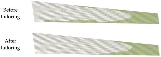 Since the shapes of the layers obtained from the free-size optimization are not regularly distributed, which creates a great difficulty in manufacturing, it is necessary to analyze and tailor each layer block to make it manufacturable and to prepare it for the next step in size optimization. It should be noted that the more conservative tailoring treatment was used, so it resulted in a slight increase in mass. Figure 15 shows the process of tailoring one of the layers of the skin.