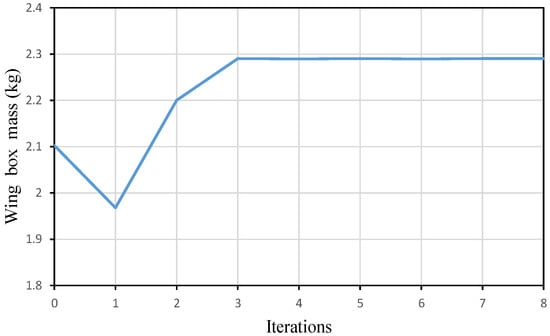 Seeking to minimize wing box mass as the same design objective, we add wingtip displacement constraints. Figure 16 shows the optimization history of the objective function with the number of iterations. As shown in the figure, after eight steps of iteration, the mass of the optimized wing box is converged to 2.29 kg, which indicates an increase of 8.1% relative to the mass of 2.10 kg after tailoring, which is due to the wingtip displacement constraints. The optimization history of the objective function (wing box mass) with the number of iterations is shown in Figure 16.