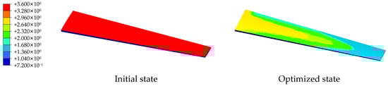 The result of the cascade order optimization is the final result of the wing box optimization. We compare the final optimized result with the initial design and show it in terms of thickness distribution. Referring to Figure 17, it can be observed that the initial state of the pavement is a complete equal thickness distribution, and the optimized pavement removes the less important cells and makes the thickness more rationally distributed.