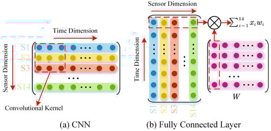 Although these methods achieved great success, they each have their own drawbacks. For the CNN-based and AE-based methods, they could extract spatial features through convolutional kernels and fully connected layers along the dimension of the sensor, as shown in Figure 1, but they lack the capacity to model time series changes. For RNN-based and transformer-based methods, they all have fully connected layers along the dimension of the sensor, thus possessing the ability to extract spatial features to a certain extent. Moreover, different from CNN-based and AE-based methods, they could model time series changes so better results may be achieved. Furthermore, compared with RNN-based methods, Transformer-based methods have the capacity to capture long time dependencies, so they may perform better than RNN-based methods when dealing with long time series data []. However, for extracting spatial features using fully connected layers, a problem exists, i.e., only the loss function is used to constrain the values of linear weights and the learned weights may not reflects the true relationships between sensors, leading to suboptimal results. Thus, to make our trained model better extract true relationships between sensors, some other methods need to be introduced.