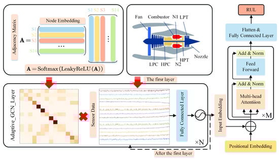 Graph neural networks (GNNs) [], emerging as a kind of effective deep learning method, are developed to deal with graph-structured data. As the sensors in aero-engines intercorrelate with each other, it forms a kind of natural graph-structured data, with the sensors as nodes and relationships as edges. GNNs take the relationships between nodes into account explicitly, equivalent to adding a constraint compared to a linear weight whose elements could take any value. So the learned results may have a better approximation to the true situations. But general GNNs could not model time series changes, so some researchers combined GNNs with RNN-based methods to perform RUL prediction. For example, Li et al. [] proposed a directed acyclic graph (DAG) network that combines LSTM and a CNN to predict the RUL. Kong et al. [] combined a graph attention network (GAT) and LSTM to develop a graph neural network (GNN)-based spatio-temporal fusion attention (STFA) approach. But these methods may not be suitable for extracting long time dependencies, which may lead to suboptimal results. Moreover, little research combined GNN with the Transformer, whose performance is better than RNN when we deal with long time series data, to make RUL prediction. Based on this research result, we propose a new method called the adaptive graph convolutional transformer encoder (AGCTE) using the graph convolutional network (GCN) [] and the Transformer encoder.