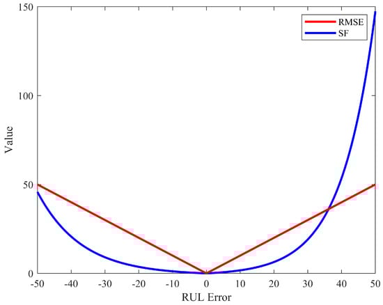 where and are the predicted and ground-truth RUL of the i-th engine; is the engine number of the testing set. The curves of RMSE and SF are plotted in Figure 4. The Score Function (SF) indicator was initially introduced in the PHM08 data competition and has since been widely utilized in remaining useful life (RUL) prediction to evaluate the performance of RUL models. Its significance can be elucidated as follows: when the predicted results deviate significantly from the actual RUL values, the resultant loss is substantial and the greater the disparity, the more pronounced the loss. Therefore, to mitigate such scenarios, the SF is formulated as an exponential function of the deviation, enabling the selection of models capable of minimizing substantial losses. Moreover, it is notable that there is a greater penalty imposed on predictions where the estimated RUL exceeds the actual RUL. This is because if the predicted RUL falls short of the actual RUL, it may not lead to catastrophic consequences, as appropriate maintenance measures could potentially extend the RUL. Conversely, if the predicted RUL surpasses the actual RUL, the situation is reversed. Consequently, predictions with an overestimation incur heavier penalties, reflecting the increased severity of such discrepancies.