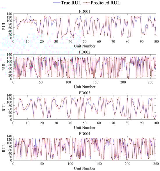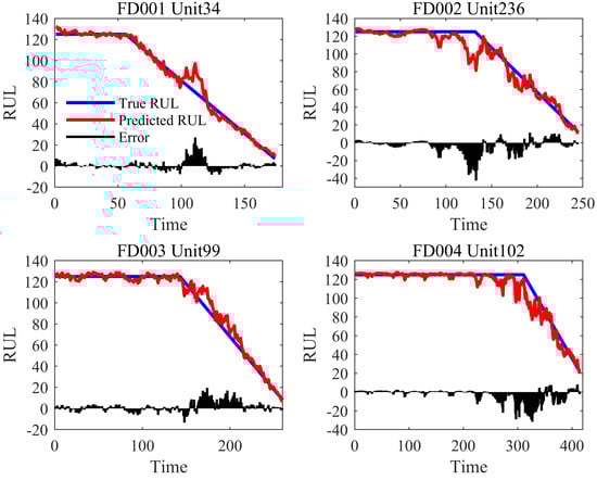 Moreover, four examples of the predicted RUL are depicted in Figure 5 and the comparison of the predicted RUL and the ground-truth RUL of the testing set of each subdataset are shown in Figure 6. From Figure 5, we can see that the error between the predicted RUL and the ground-truth RUL is relatively small in much of the time. In this phenomenon, our model could learn the linear degradation trend of aero-engines relatively well. From Figure 6, we can see that the run-to-failure prediction results are quite close to the ground-truth values, which is consistent with the results shown in Table 3 and Table 4 and demonstrates the effectiveness of our proposed model again.