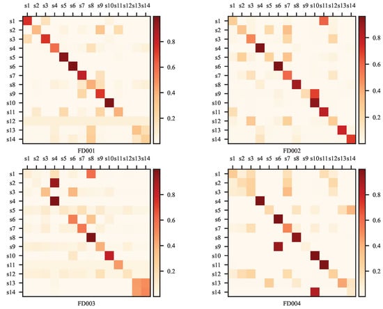 From Table 5, it can be observed that average performances of the ablation models both have some decreases at different degrees, illustrating the effectiveness of combining GCN and the Transformer encoder together. Moreover, the performance of the model AGCTE-w/o Transformer decreases greatly, which demonstrates the significance of the Transformer encoder in RUL prediction. In addition, as depicted in Figure 1, the Transformer has fully connected layers along sensor dimension, thus possessing the capacity of extracting spatial features to a certain extent. But as we can see in Table 4, after adding the GCN part, the performance has certain improvements. This experiment result reveals that GCN can better extract spatial features that fully connect layers, as GCN takes the relationships between sensor explicitly. The learned adjacency matrixes are shown in Figure 7.