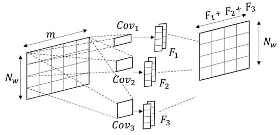 CNNs have strengths in processing high-dimensional data, and the original position relationship is still retained after the convolution operation. Therefore, CNNs are widely applied to feature extraction []. To avoid the effect of the change of engine sensor order on the prediction result, the 1-Dimensional (1D) convolution kernel is required. The width of the 1D convolution kernel is the same as the sample, while the length and amount of convolution kernels are artificially set as hyperparameters. However, a single-length 1D convolutional kernel is not sufficient to extract the complex degradation features of the engine, so the Multi-Scale Convolutional Neural Network (MSCNN) is necessary []. The structure of the MSCNN model is shown in Figure 2. and denote the width and length of the samples; , , and are three different sizes of 1D convolution kernels; , , and are the amount of , , and used.