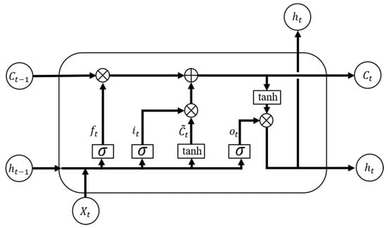 The RNN has a ring structure and handles short-term memory well but is unable to perform long-term memory output. The LSTM adds a cellular state to the RNN, reducing the possibility of gradient disappearance and gradient explosion []. Figure 3 shows the structure of the LSTM cell.