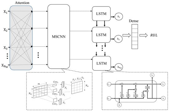 The network structure of the proposed method is shown in Figure 4. Firstly, the attention mechanisms are utilized to handle the multiple operating conditions of the engine. This attention mechanism helps to capture the varying dynamics and characteristics of the engine under different operating conditions. Secondly, the multi-scale CNN component extracts spatial features at different time scales. By applying convolutional filters of varying sizes, the model can capture both local and global patterns in the input data. Lastly, the LSTM networks are employed to capture temporal dependencies and patterns in the engine data. By utilizing memory cells and gates, LSTM networks can effectively model and remember long-term dependencies in the time-series data. This is particularly useful in RUL prediction tasks, where historical patterns and trends often play a crucial role in determining the remaining useful life of the engine.