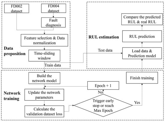 The experimental flow is shown in Figure 5. First, classify the data into different fault categories and extract the engine data diagnosed as HPC degradation fault to create training and testing datasets. Then, the engine sensor data need to be pre-processed, including normalization and sliding window. Normalization is used to eliminate the influence of different sensor data with different units on the prediction results. Sliding window is used to ensure that the input dimensions are consistent for each sample.