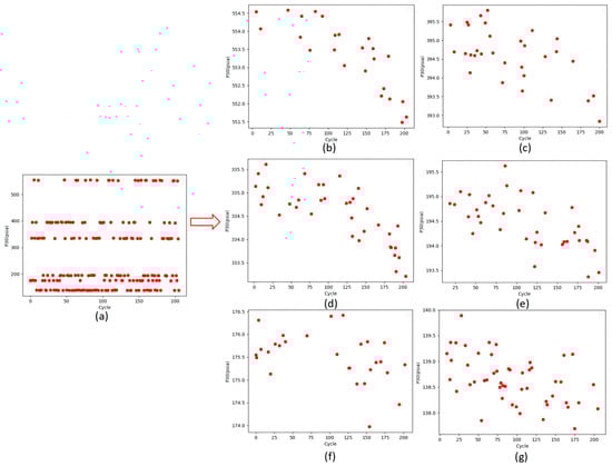 Figure 6a illustrates the phenomenon of data discontinuities before the classification of operating conditions due to the changes in engine operating conditions throughout the operating cycles. It is difficult to observe any degradation trends. However, Figure 6b–e represent the scatter plots of P30 data for each individual operating condition after the classification. Upon conducting the operating condition classification, it becomes evident that the initially discontinuous data undergo a transformation into six scatter plots, each exhibiting a distinct degradation trend.