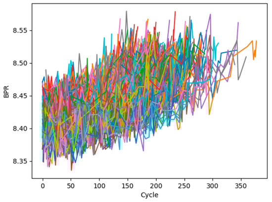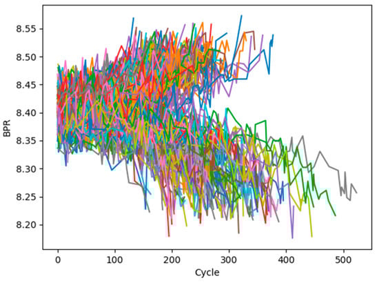 When classifying engine failures, the sensor data tends to exhibit abrupt changes due to variations in operating conditions at different time points. As shown in Figure 6a, however, when performing condition-based classification, significant trends can be observed in the data under a single operating condition without complex abrupt changes. Therefore, Figure 7 and Figure 8 illustrate the variations in BPR data for all engines in the FD002 and FD004 training datasets under a single operating condition. It can be observed that the BPR data in the FD002 training set only show an increasing trend, as it has only one fault mode. In contrast, the FD004 training dataset contains two fault modes, resulting in two distinct trends in the data. Based on this phenomenon, a decline index can be designed to differentiate between these two types of faults.