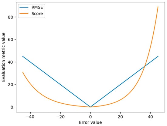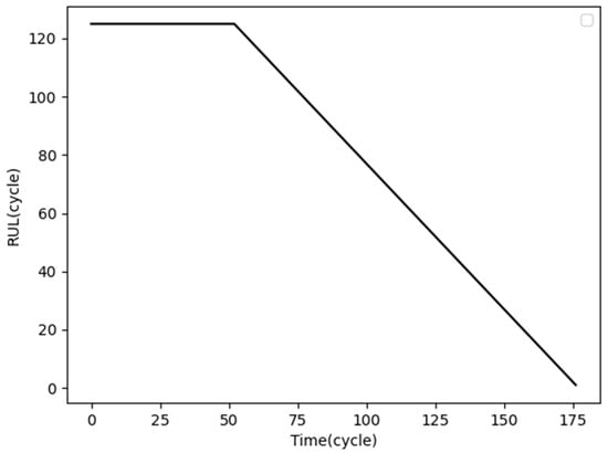 In the early stages of engine operation, due to the relative newness of the engine, it has a low failure rate, and the data change slowly. After that, the failure rate increases rapidly as the engine’s running time increases. Following previous work [], a piecewise RUL labeling method was used, as shown in Figure 9. During the early stage of engine operation, RUL of the engine keeps a constant value, and then linearly decline until complete failure. Setting the initial RUL to 125 can achieve a better performance.