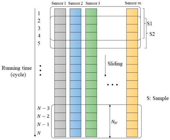 Each engine’s historical monitoring data are a time series, and because each engine’s running cycles are different, the lengths of these time series are not the same. To make each sample equal on the time scale, we use a sliding window to reconstruct the data, as shown in Figure 10. Suppose the historical data of an engine are , where is the number of monitored sensors and is the length of the time series. After the window sliding, we obtain the sample , where is the length of each sample in time dimension. After the sliding window, the historical data of one engine can be reconstructed into multiple samples containing the same time series length.