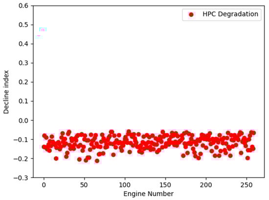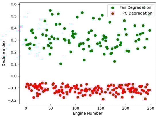 where represents the slope and represents the set of operating cycles for the engine under operating condition . Then, according to Equation (15), the decline index of different sensors in the engine is weighted and summed to obtain the final decay index.