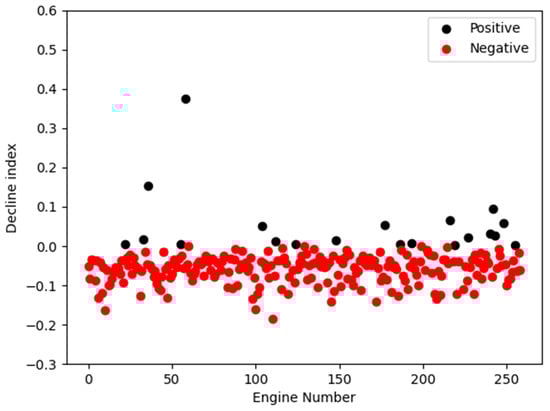 The x-axis represents the engine number, and the y-axis represents the decline index of the engine. Figure 12 is a scatter plot of the decline index values of all 260 engines in the FD002 training set. It is evident that all engines exhibit decline index values below 0. Figure 13 is a plot of the decline index values for all 249 engines in the FD004 training set. For the FD004 training set, engines with decline index values less than 0 are classified as experiencing HPC degradation faults, while engines with decline index values greater than 0 are classified as experiencing FAN degradation faults. Figure 13 clearly shows the distinct boundary between the two fault categories.