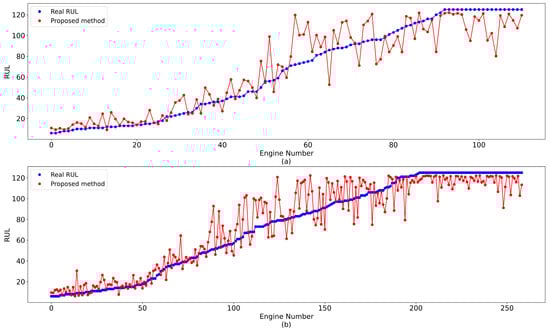 RUL prediction results of test dataset: (a) FD004 (HPC degradation) test dataset, and (b) FD002 test dataset.