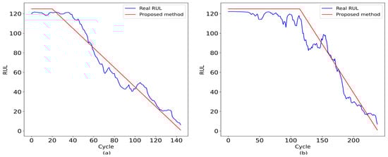 RUL prediction results. (a) shows an engine in FD002, and (b) shows an engine in FD004.