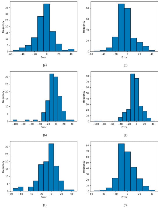 Error distribution histogram. (a–c) are FD002 test dataset results. (d–f) are FD004 test dataset (HPC degradation) results. (a,d) use FD002 training dataset and FD004 training dataset (HPC degradation). (b,e) use FD002 training dataset and FD004 training dataset. (c) uses FD002 training dataset. (f) uses FD004 training dataset.
