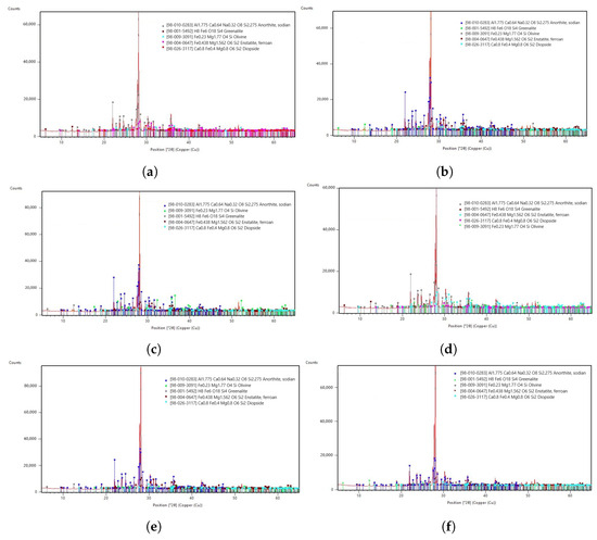 In Figure 1, the spectrograms are plotted for the different grain size intervals. Five main minerals were taken into consideration: anorthite (sodian), greenalite, olivine, enstatite (ferroan), and diopside. Comparing the spectra, it can be noticed that the main peak occurred at the same angular position, which was also followed by the other high peaks in the 20–40 position (2) range; actually, they mainly corresponded to the anorthite diffraction pattern, and their intensity, i.e., the number of counts, reflected its abundance (see Table 1). Regarding the other peaks, the number of counts was very similar in all measurements, highlighting a substantial homogeneity in composition in all size intervals. A small note can be presented on olivine: its presence was slightly enhanced in the 75–150 μm interval, whereas it was not present in the biggest particles (>400 μm). Finally, greenalite and enstatite were not directly present in the regolith composition (Table 1), but they contributed to the number of elements and oxides present in the simulant.