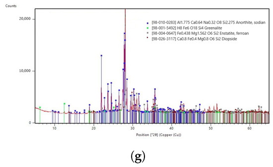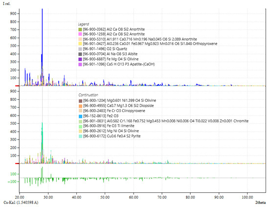 XRD analyses were also performed to compare the virgin simulant with the one that underwent the solid-state carbothermal reduction with methane. These analyses were performed with an XRD Rigaku SmartLab SE device. The powder diffractometer used a Bragg–Brentano geometry, and the and radiations adopted had wavelengths of and . The post-processing of the results was performed using Match!®v3.15software by Crystal Impact (https://www.crystalimpact.com/match/ (accessed on 7 April 2024)). The spectra were analysed by looking for a set of minerals that should be present in the NU-LHT-2M simulant [30]; the same set was adopted in the two analyses.