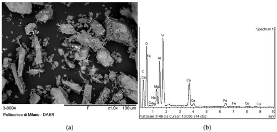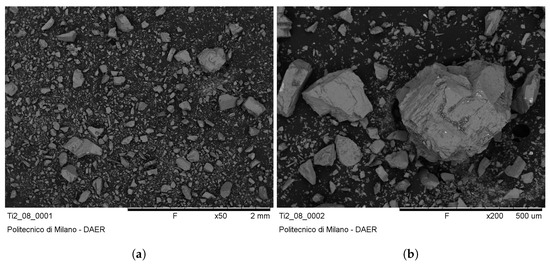 Looking at the virgin material, three images with different magnifications are reported in Figure 3a,b and Figure 4a. In the latter, the measure of the grains is also reported. The EDX probe detected most of the elements, as reported in Figure 4b, with results that were comparable with the ones reported in Section 4.1.1. The images, in particular the last one, instead show the complex fragmented nature of the regolith plus the variety of grain sizes present; this will have effects on the degree of compactness that can be reached due to the difficulty of the grains to settle in a more organised way. However, this feature helps the gas mixture to permeate the batch. With higher magnification, it would have been possible to appreciate the difference in the depositional features of the grains as the simulant did not undergo exposure to any lunar surface phenomena. This may cause the introduction of an efficiency, caused by the contact between the gas and the solid, as some sites may be more accessible than others.