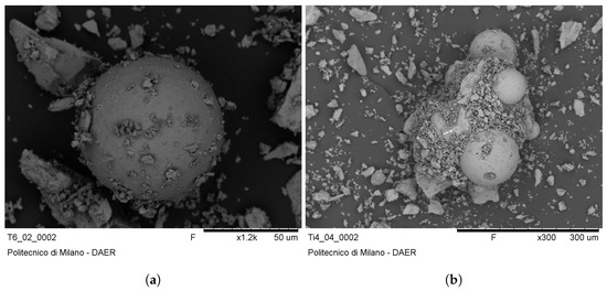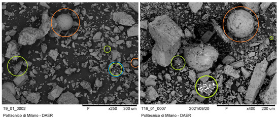 The appearance of processed samples differed from the virgin ones. In Figure 5, three features that are not present in the virgin simulant are identified: spherical elements that can be related to the presence of silica; dark agglomerates covered by coke; and agglomerates with bright elements that can be linked to the presence of earth alkaline materials.