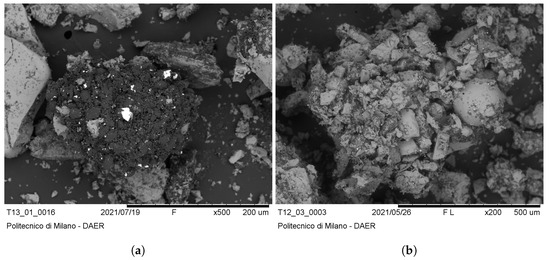 These tests provide detailed high-magnification images of the sample, elemental identification, and quantitative composition information using a focused beam of electrons to produce images of a sample surface topography. SEM analyses were performed on non-processed simulants but also on samples that underwent the carbothermal reduction. For the virgin material, it was complemented with EDX to obtain an additional understanding of the surface material, acquiring the elemental composition of the sample. The processed samples were analysed after each test performed in the 2020–2021 experimental campaign on the terrestrial ISRU demonstrator developed at PoliMi DAER [18]. This is useful for assessing the impact of the process and different parameters by examining the dimensions and shape of the grains and their peculiarities.