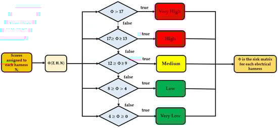 The initiation of the kernel size, denoted as Xi, for the case study of the electrical harness in a military aircraft C295 follows the steps depicted in Figure 2. It shows the algorithm structure and highlights the different values of the risk matrix for each range associated with scores assigned to the dataset. A red color is assigned for a very high and high risk; yellow for a medium risk; and green for a low and very low risk of error creation.