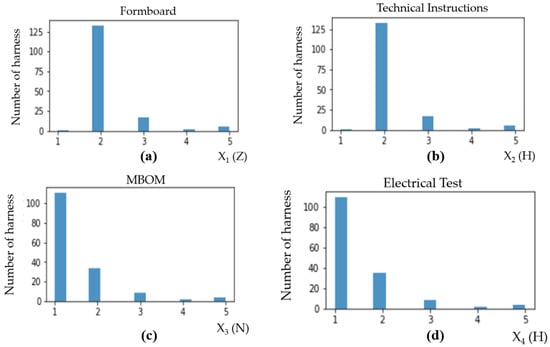Histograms showing the quantity of harness part numbers on ‘y’ axis and the scores assigned on ‘x’ axis for each input parameter. Histogram (a) represents parameter ; (b) parameter ; (c) parameter ; (d) parameter .