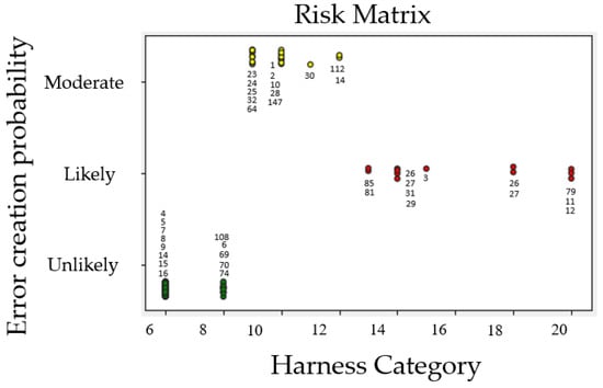 Figure 4 shows the risk matrix function evaluated for each harness within the dataset and the probability associated with the error creation during the manufacturing engineering processes in a color code.