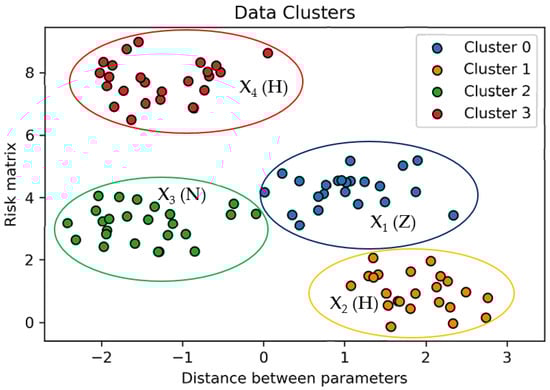 The algorithm used in this study applies clustering to analyze and to classify datasets. Figure 5 presents the clustering of data points defined by the risk matrix. Thus, ‘Formboard’ (FB) is represented by cluster 0 (in blue), ‘Technical Instructions’ (IT) by cluster 1 (in orange), ‘Manufacturing Bill of Material’ (MBOM) by cluster 2 (in green), and ‘Electrical Test’ (ET) by cluster 3 (in red).
