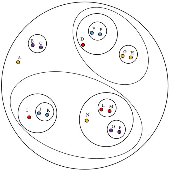 Hierarchical clustering establishes relationships between similar datasets grouped into clusters and labeled by letters from A to P.