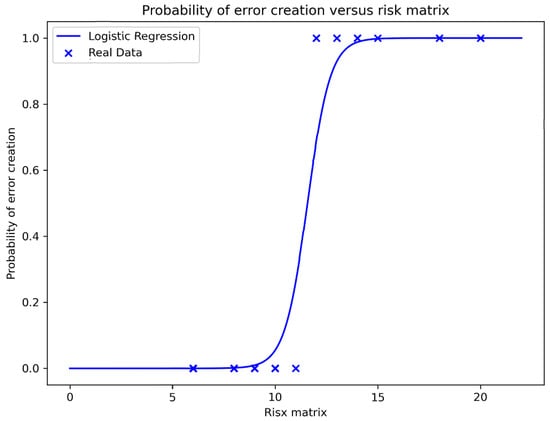 The best fit for the outcome categorical variable is defined by a logistic regression. Figure 7 represents the relationship between the probability of error creation and the risk matrix. The risk matrix function presents different values for each harness within the dataset. The probability function associated with the logistic regression is used for new data predictions. The logistic regression passes the input through the logistic/sigmoid function and then treats the outcome result as a probability [29].