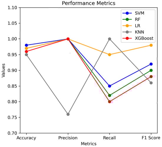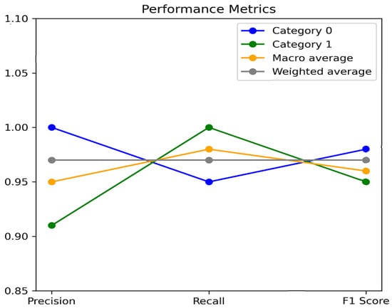 In addition, the machine learning classification report provides some additional values as outcomes. Category 0 represents the negative class that means ‘no error creation’, and category 1 represents the positive class, meaning ‘error creation’. The macro-average is the average of the precision, recall, and F1-score. The weighted average is the weighted average of the precision, recall, and F1 scores, as shown in Table 3. The performance metrics are depicted in Figure 8.