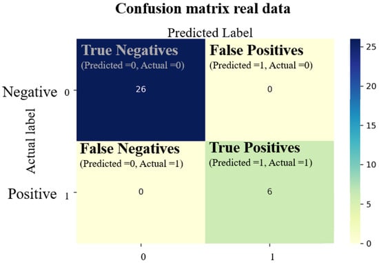 From the confusion matrix, the predictions show the good performance of the algorithm. True positives (TP): Prediction is a value that matches reality. The element at (1,1) represents the six data samples as true positives classified as ‘error creation’. True negatives (TN): The prediction value also matches reality. The element at (0,0) represents the 26 data samples as true negatives classified as ‘no error creation’. The diagonal elements represent the instances that are correctly classified. False positives (FP) and false negatives (FN) are off-diagonal elements representing the number of instances incorrectly classified.