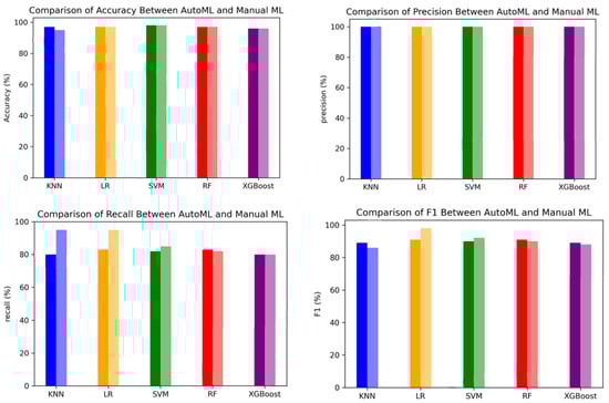 Figure 17 shows the performance metrics obtained using AutoML and traditional ML for each of the AI methods proposed. In each graph, the darker-colored bars represent the metrics obtained using AutoML and the lighter-colored bars represent the metrics using manual ML. The highest deviation appears in recall in KNN, showing a difference of 15% between AutoML and the manual approach. LR presents the highest difference of 12% in recall. The methods SVM, RF, and XGBoost show a difference up to 3% in recall and F1. The results show that leveraging AutoML can find the best classifier while reducing the time invested in manual ML.
