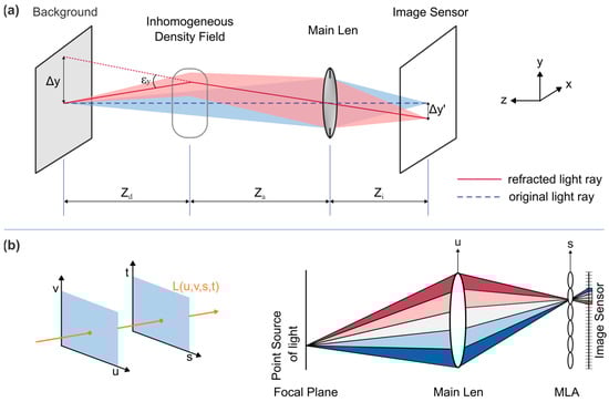 Principle diagram of plenoptic BOS. (a) Geometric relationship in the BOS configuration. (b) 4D light-field model (left), and schematic of imaging with a plenoptic camera (right).