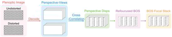 Early single-view plenoptic BOS systems used focus stacks for qualitative 3D density gradient localization [30]. The relevant workflow is shown in Figure 2. Plenoptic images are first taken in the presence and absence of density perturbations, respectively. Subsequently, these two images were decoded to generate the same number of perspective views. The cross-correlation of the two sets of perspective pictures yields a 2D displacement field of the background in each perspective. Finally, the BOS focus stack is created by a refocusing program that sums the displacement information by equating it to intensity.