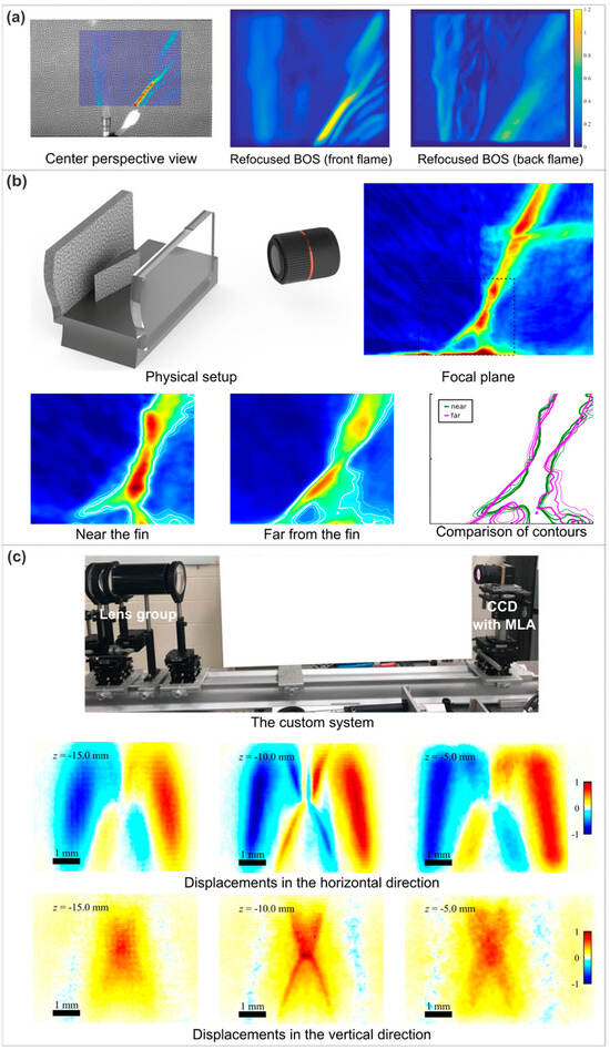 Single-view plenoptic BOS applications. (a) The displacement of the center perspective (left), and the refocused BOS images at the front flame (center) and the back flame (right). Colorbar and axes are in pixels. Reprinted with permission from reference [10]. (b) The physical arrangement in the SBLI experiment and the shock foot contours obtained at different focal planes and their comparison. Reprinted with permission from reference [13]. (c) The custom system (top) and the refocused BOS displacements in the horizontal (center) and vertical (bottom) directions. Reprinted with permission from reference [14].