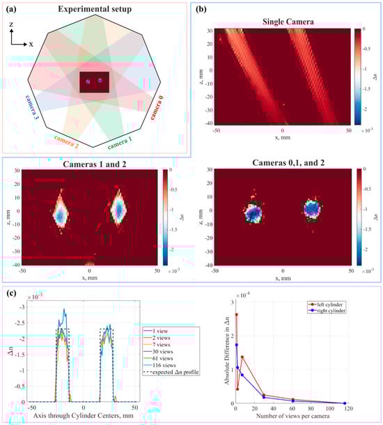 Tomographic plenoptic BOS. Reprinted with permission from reference [38]. (a) Reconstruction of four cameras overlaid on the schematic of the experimental setup for reference. (b) Reconstructions for the different camera configurations. (c) Reconstruction varying the number of perspective views used by each camera. Profile along cylinder centers (left) and |Δn116 − Δn| (right).