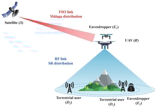 The non-orthogonal multiple access (NOMA)-based space–air–ground integrated network (SAGIN) has recently gained increasing attention for its role in enhancing channel capability, expanding communication coverage, and improving system performance [1,2]. Several studies, such as [3,4,5], have explored the outage probability, average bit error rate, and ergodic capacity of NOMA-based SAGIN systems. However, with the recent increase in communication coverage, the vulnerability of the SAGIN system signal to attacks has become a concern, prompting a heightened focus on signal security for NOMA-based SAGIN. Certain attacks, notably those involving jamming and intercepting, are inherently linked to the physical layer, posing challenges to the physical layer security (PLS) [6]. Therefore, evaluating the PLS of NOMA-based SAGIN systems has emerged as a challenging topic.